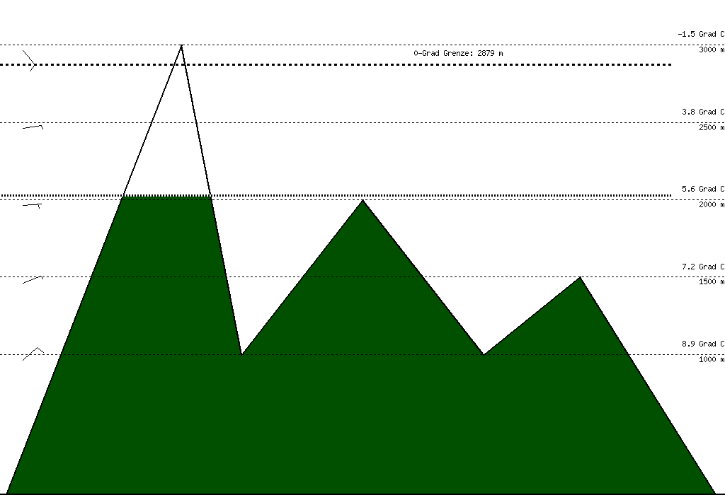 Hier erhalten Sie grafisch Informationen zu Temperaturen und Wind in den Höhenlagen bis 3000 Metern, der Nullgrad-Grenze, der aktuellen Schneefallgrenze (weiß eingezeichnet) und zur Lage der Wolkenschichten (gelb-grau eingezeichnet).